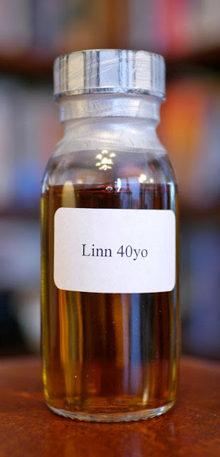 The Highland Park Linn 40 yo special edition. Opening with rich lacquer made from crushed amber taken from the props department of Jurassic Park, prayed over and fondled by Jeff Goldblum, Laura Dern, and Samuel L. Jackson as they held an impromptu sèance in an ironwood, baobab, and manzanita kiva owned by Steven Spielberg. Thrown onto the central fire to steam and scent were chunks of crystalized ginger, juicy nightcrawlers, gum tree resin, fresh bay leaves, spare ribs in Memphis BBQ sauce, ruby grapefruit pulp, and the eye of a newt. (Just kidding about the eye of a newt.) And then, from skull of a triceratops, honey. Remarkable honey made solely by maniacal queen bees working for one über-Queen bee. Winona Ryder comes in with heather from the set of Heathers. A hint of the chewing gum chewed by St. Peter as he idles away the long dull stretches at the pearly gates waiting for any pure soul to come. The crisp burnt sugar brûlée from a crème brûlée from Spago Beverly Hills used as a trivet, holding a Lalique decanter filled at the Well of Souls, ready to tip on to the fire. I never want to stop smelling this. I want my DNA restructured.